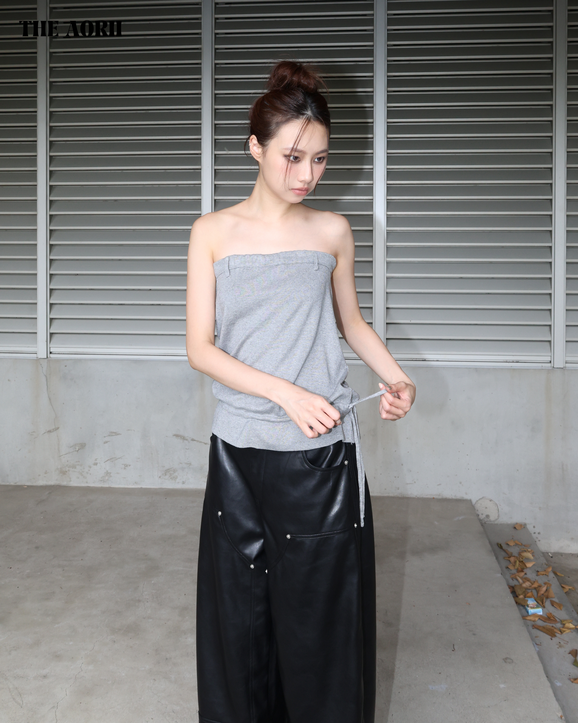 20204(2color) - 灰 皺摺平口綁帶上衣