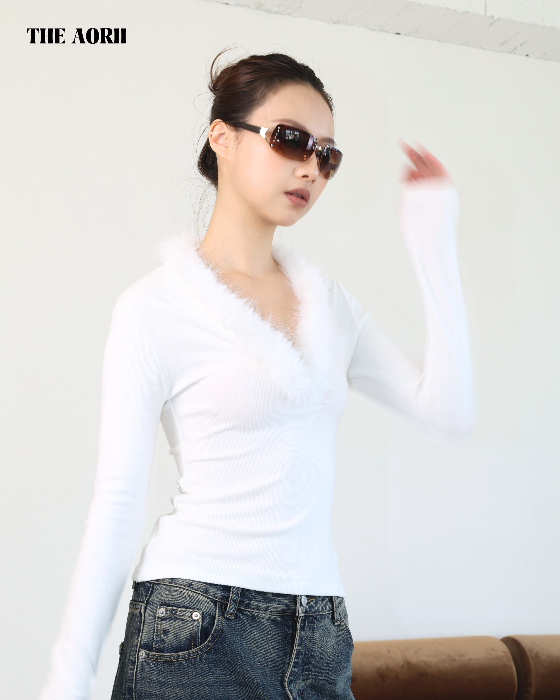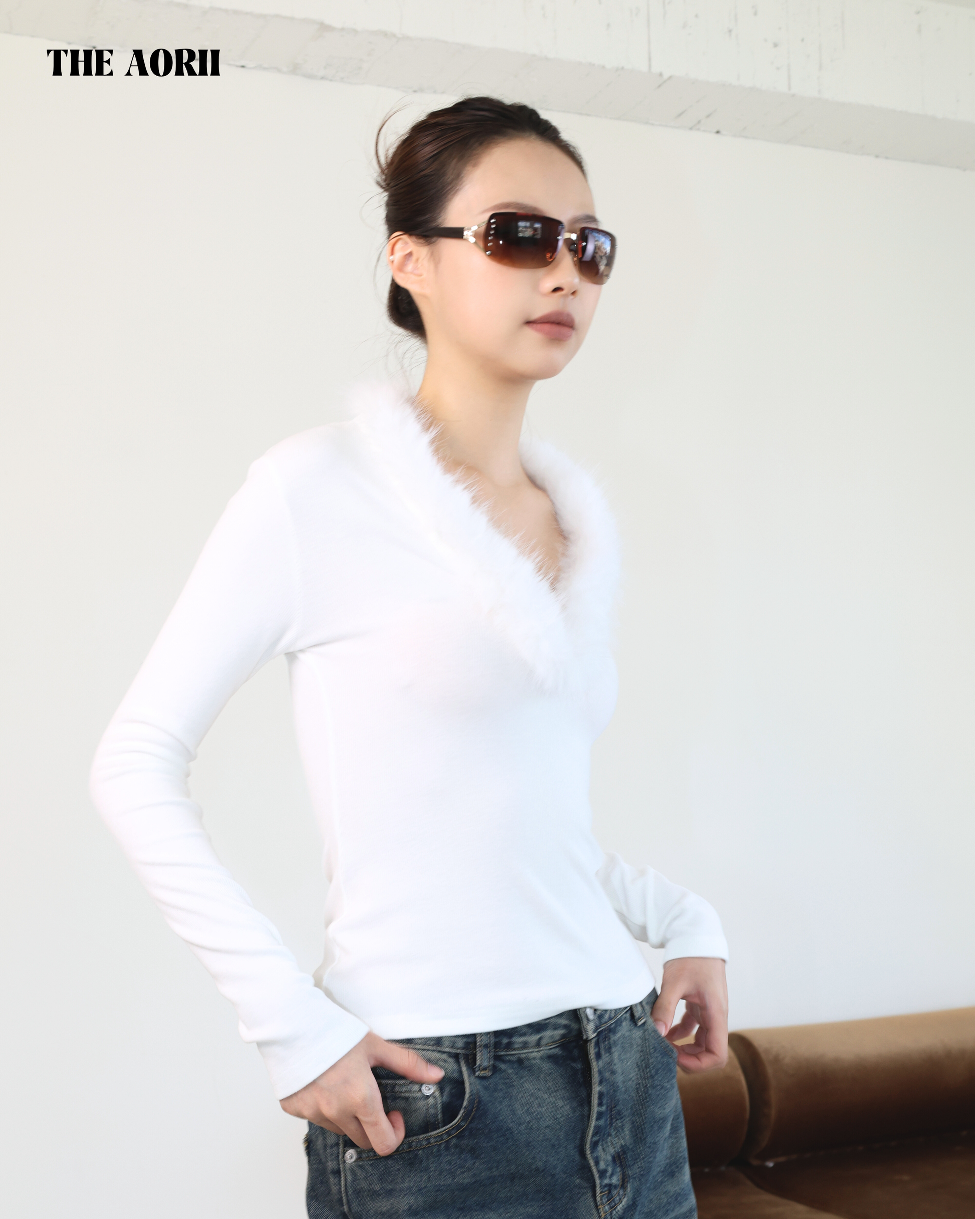 20222(2color) - 白 毛毛V領長袖修身上衣