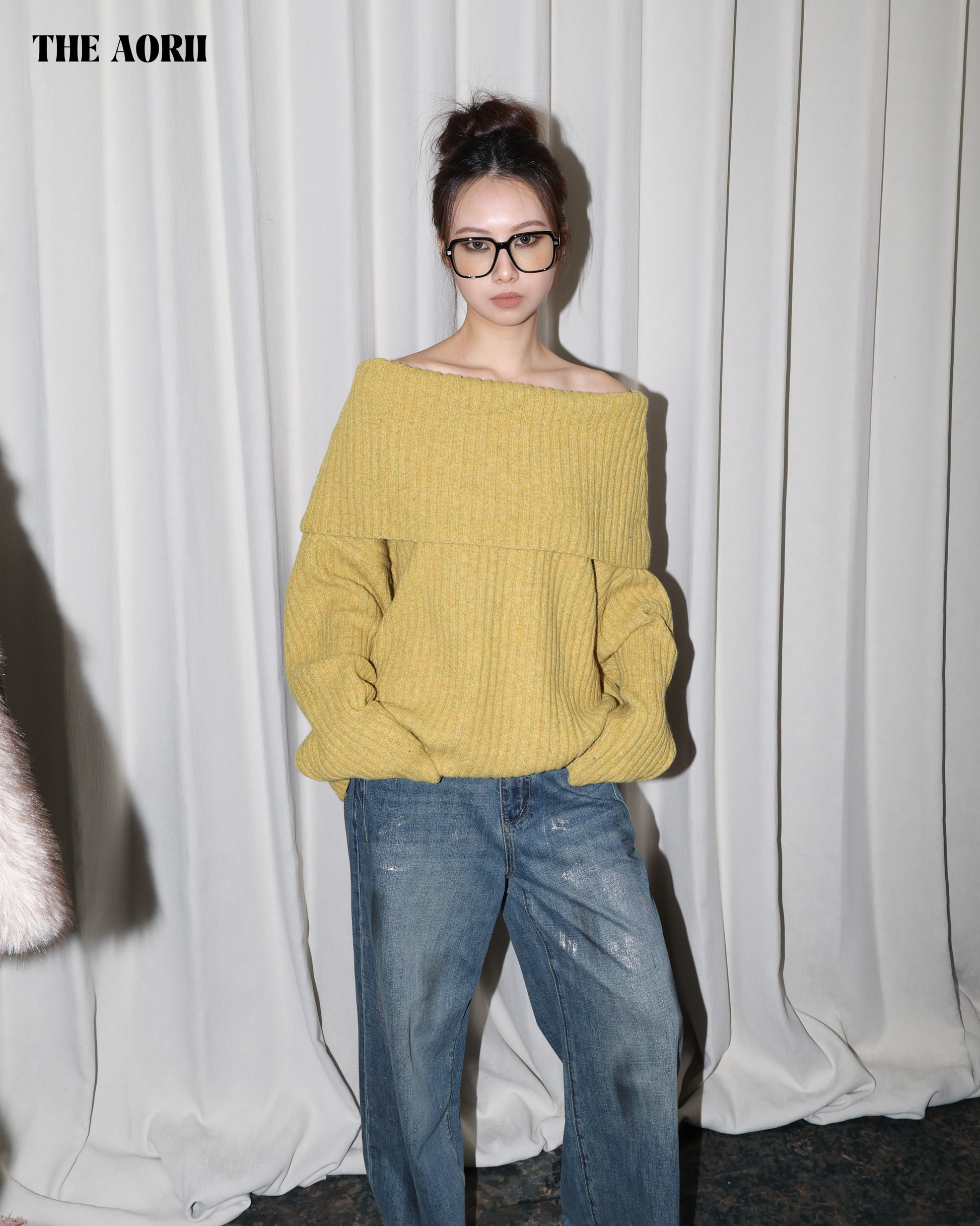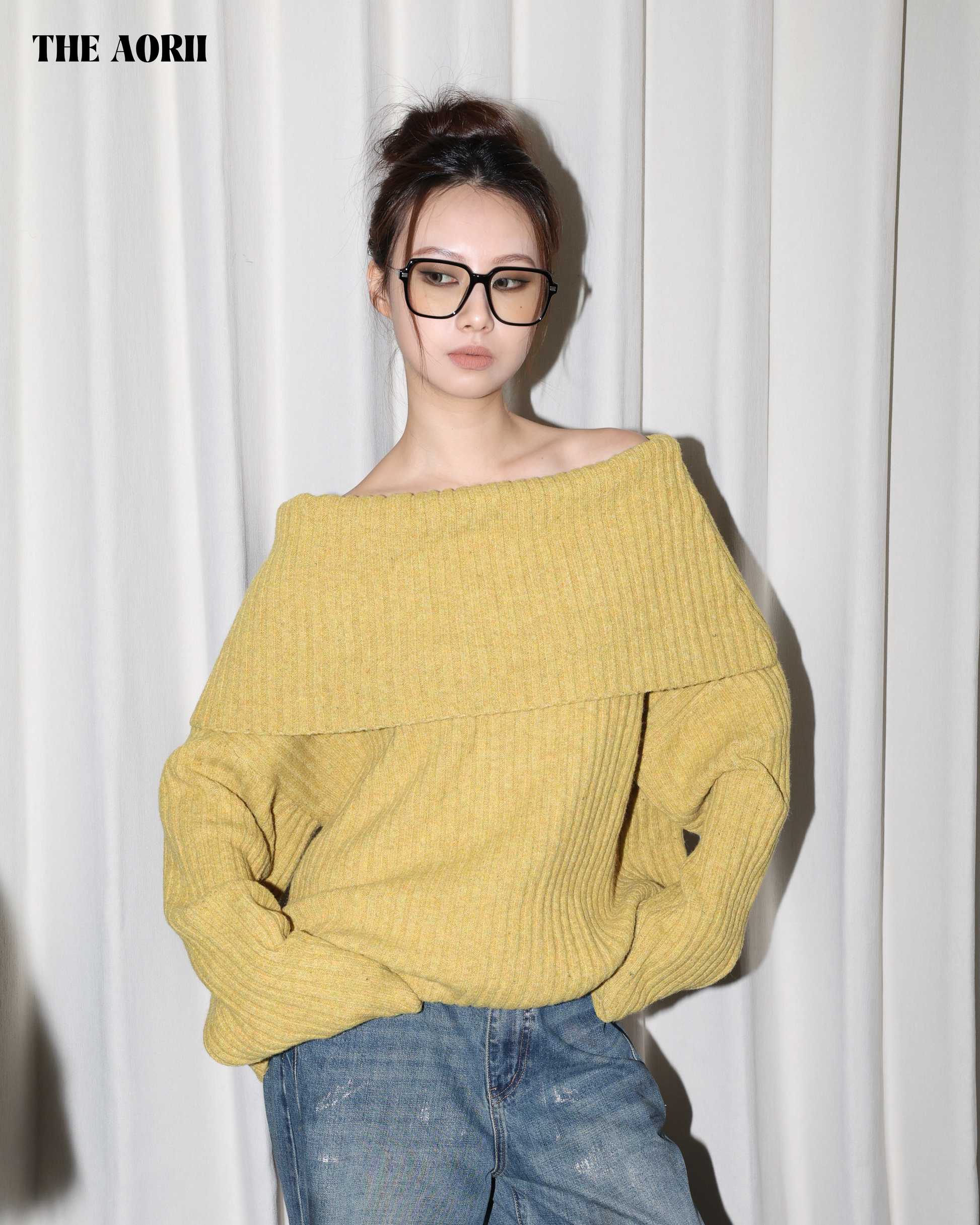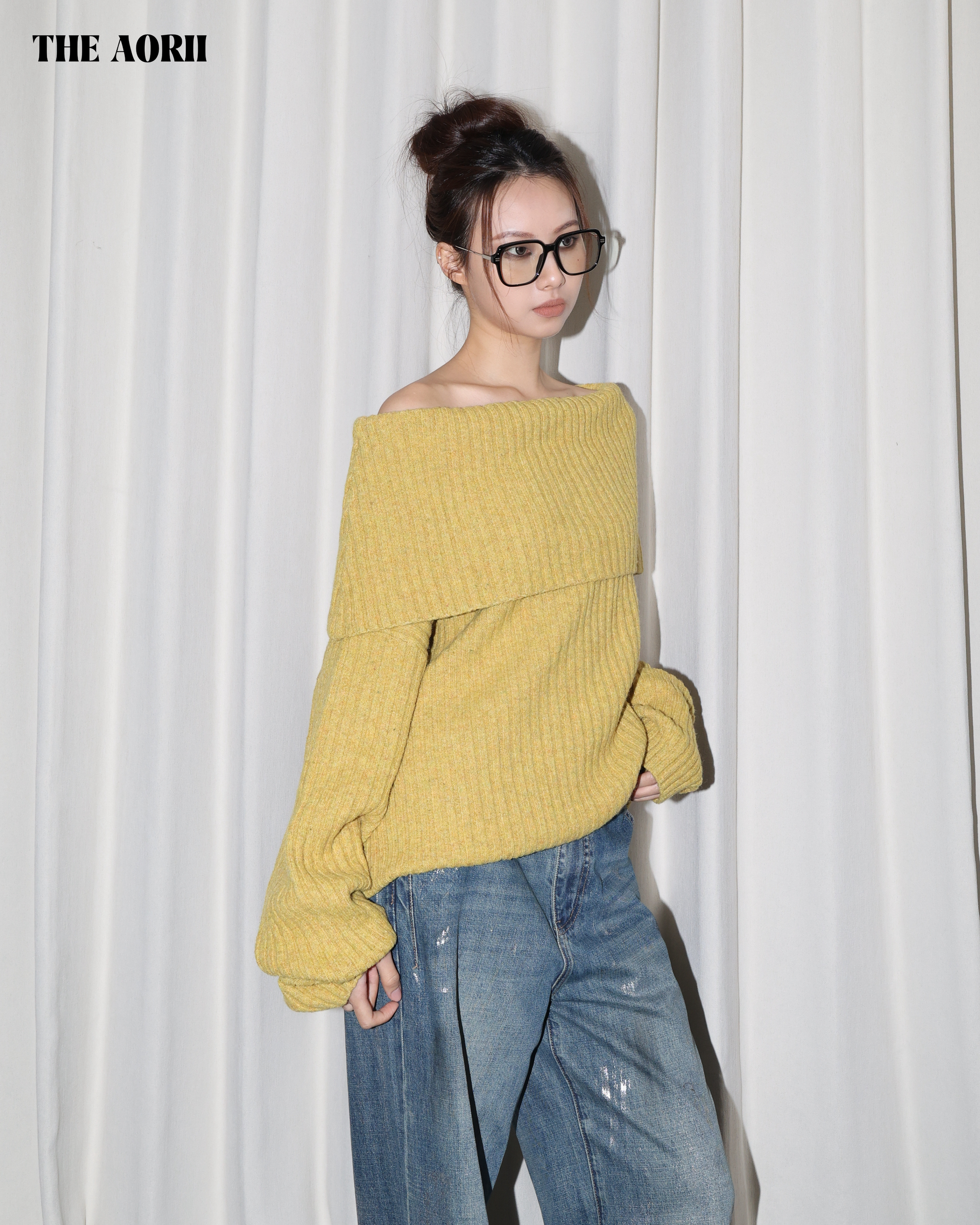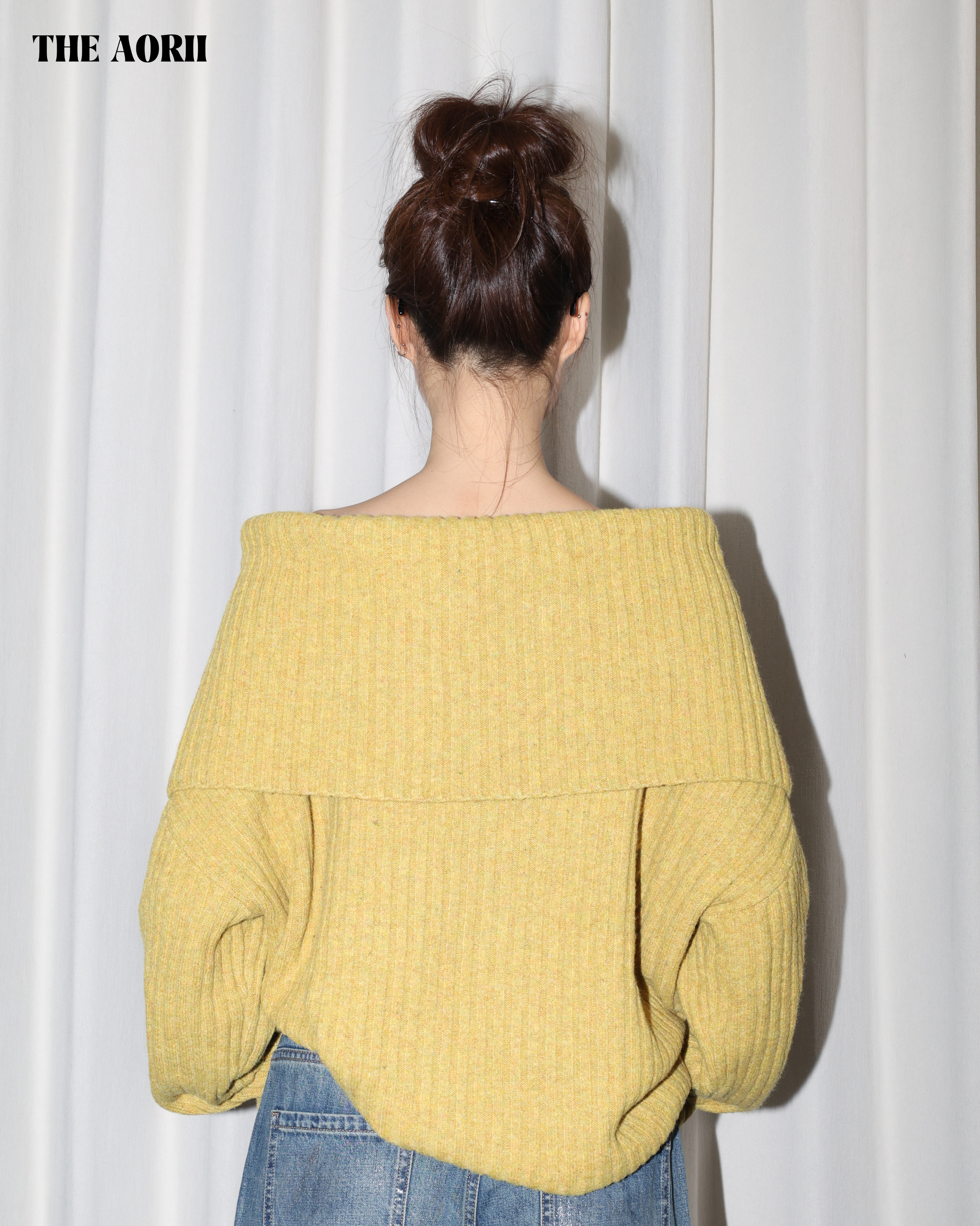 25235(2color) - 黃 10%羊毛反折一字領針織毛衣