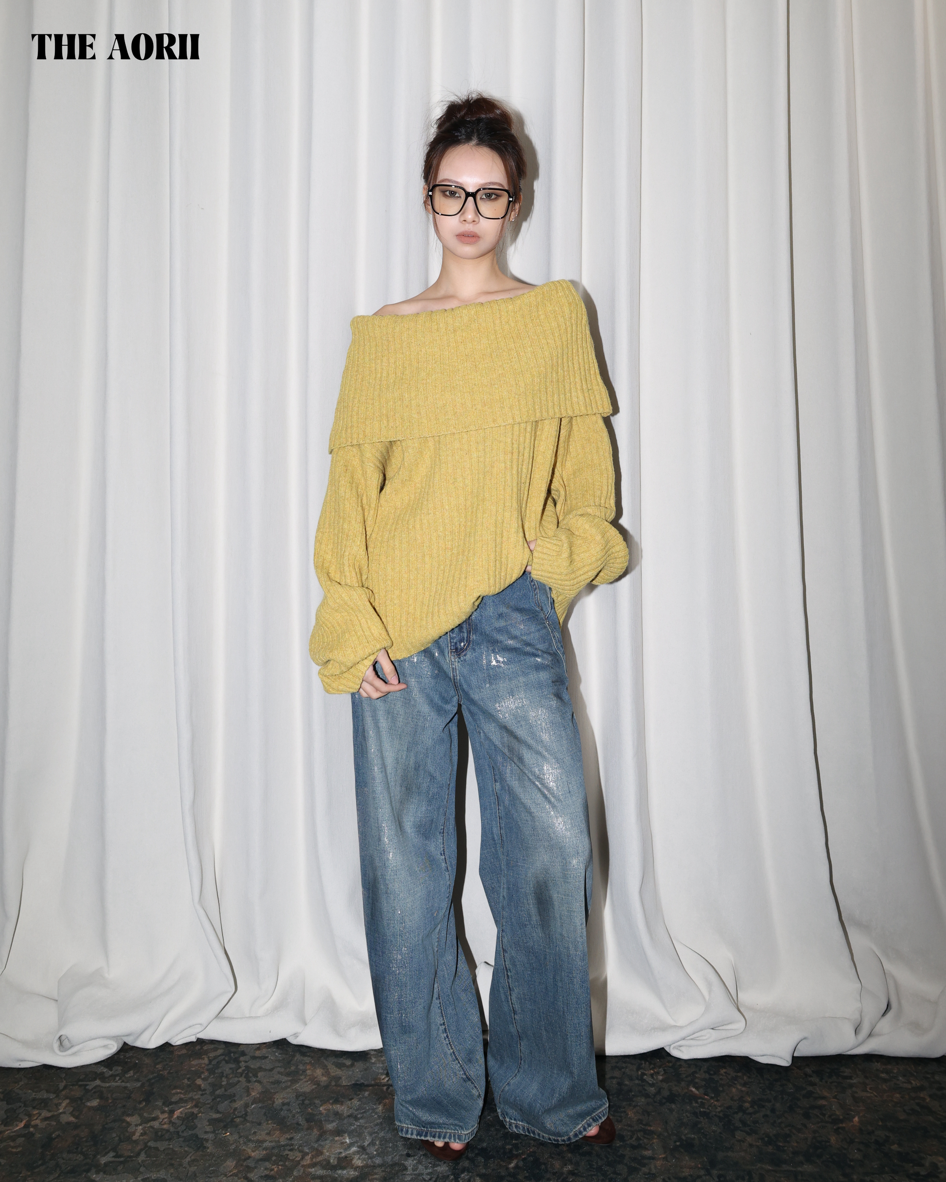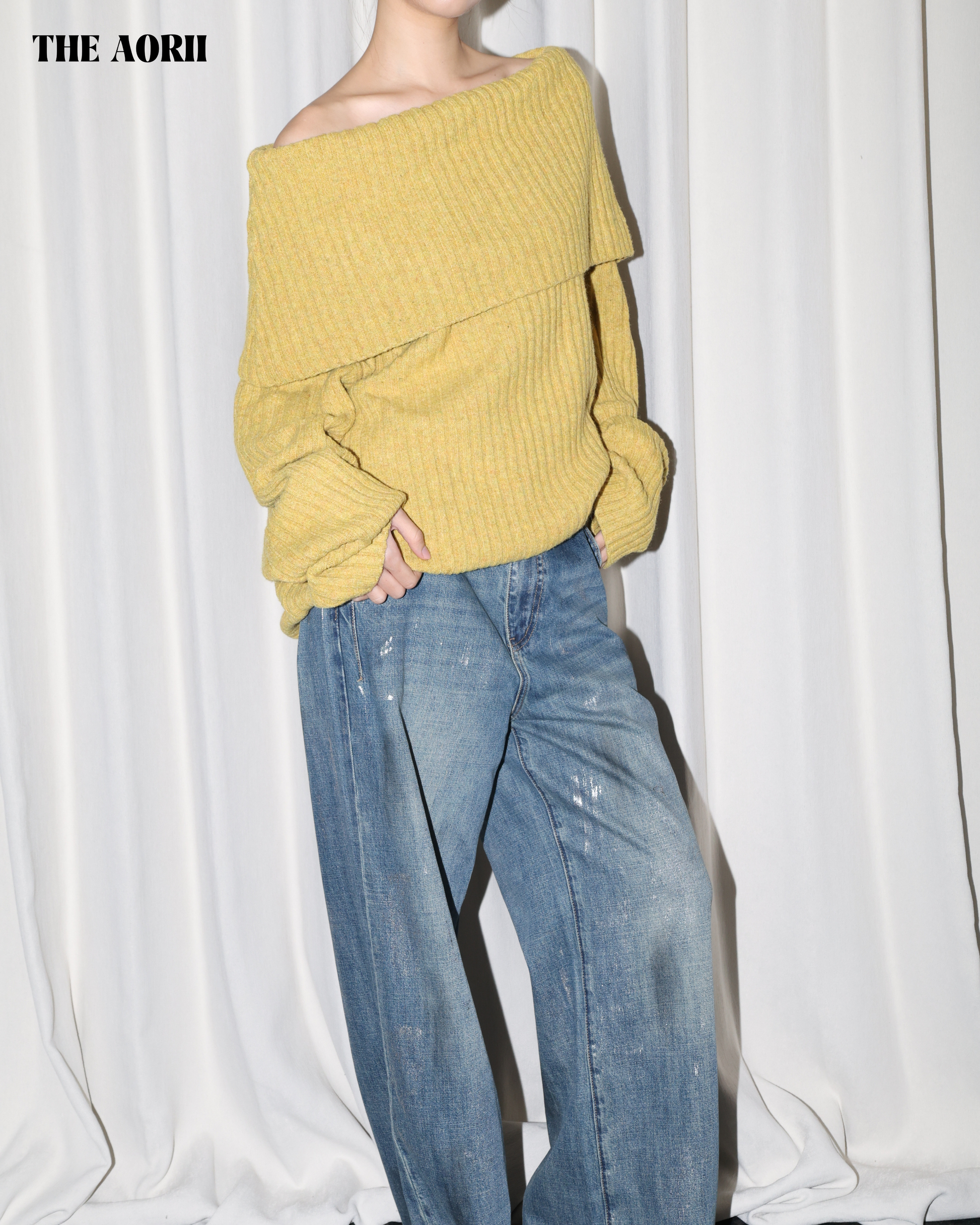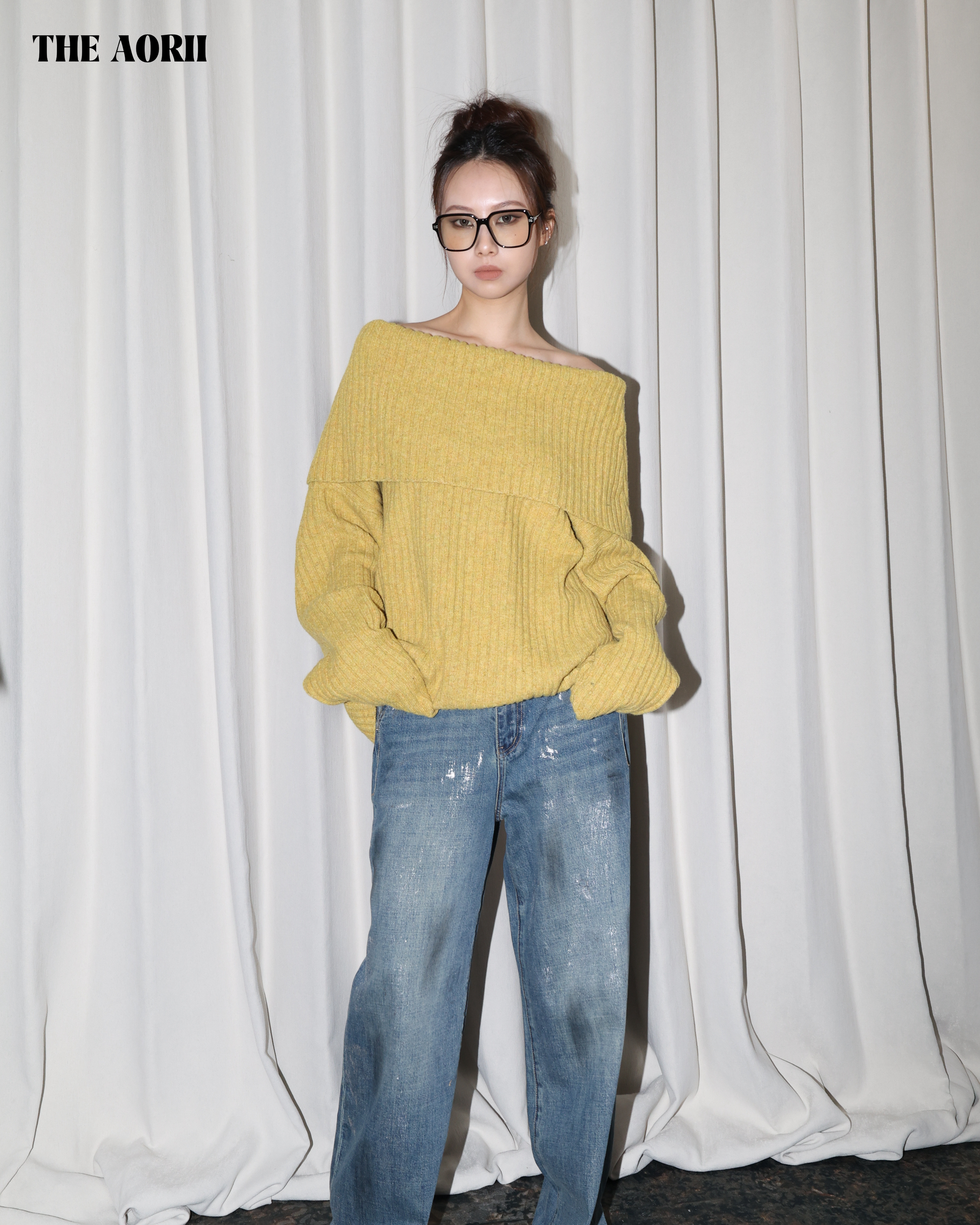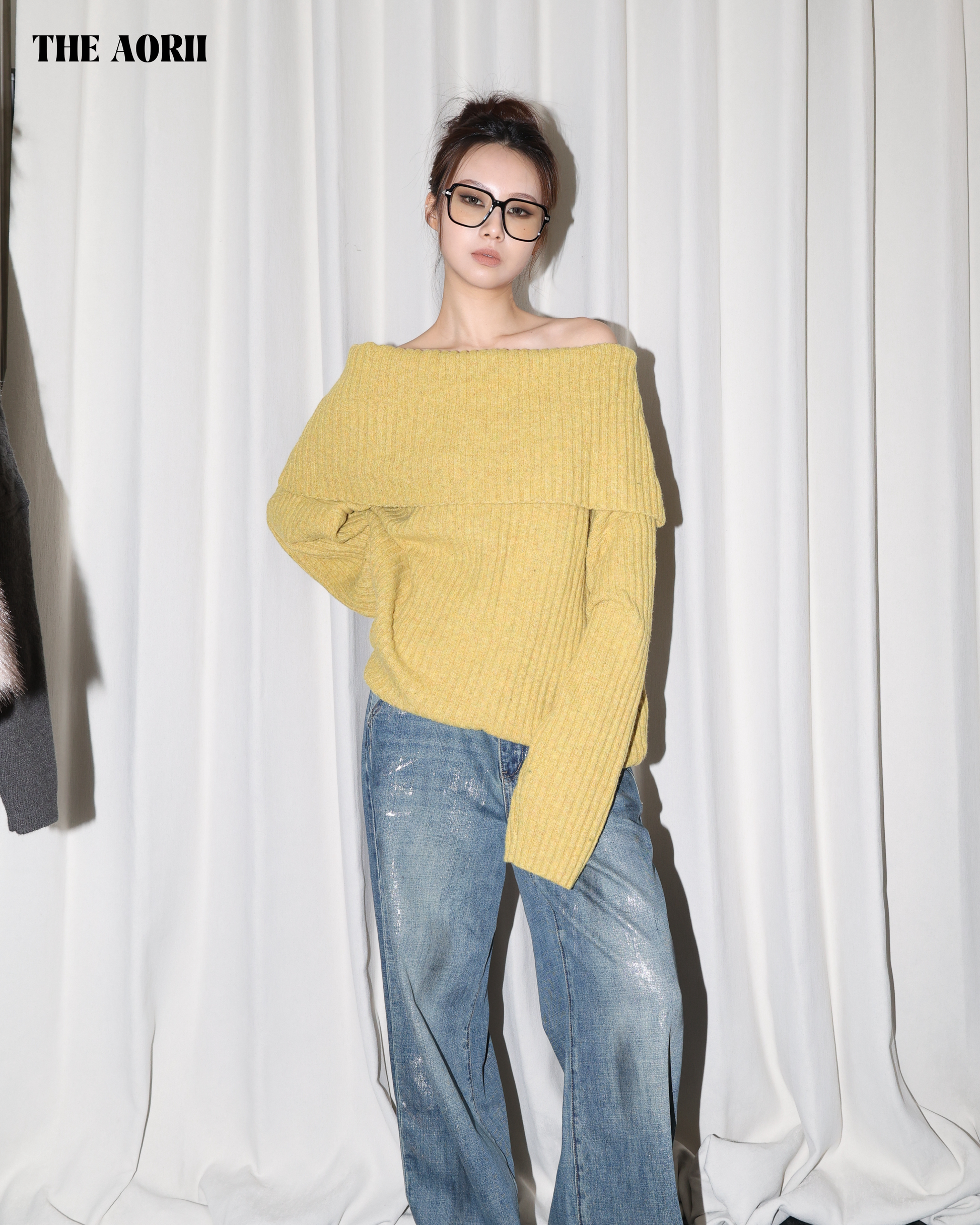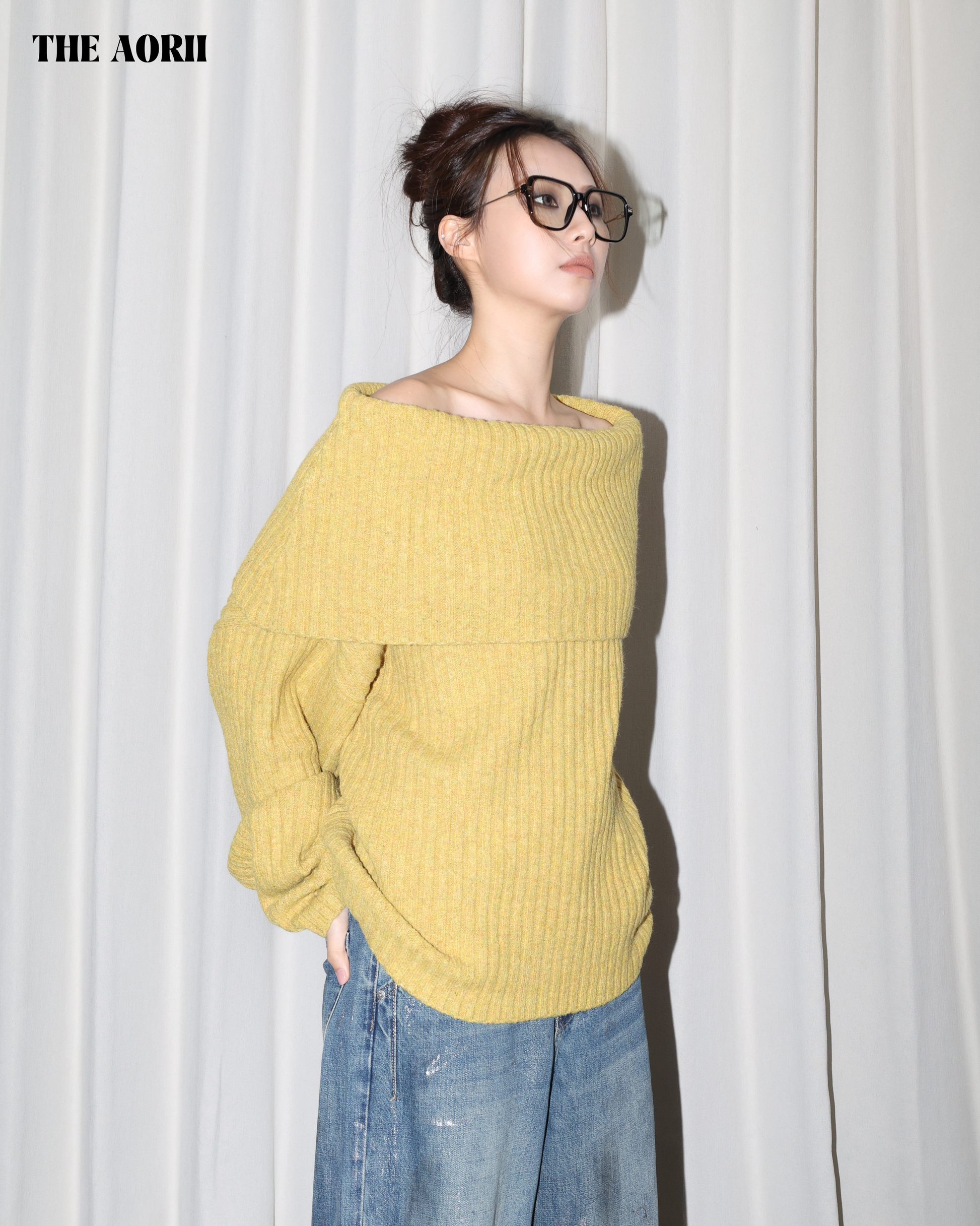 25235(2color) - 黃 10%羊毛反折一字領針織毛衣