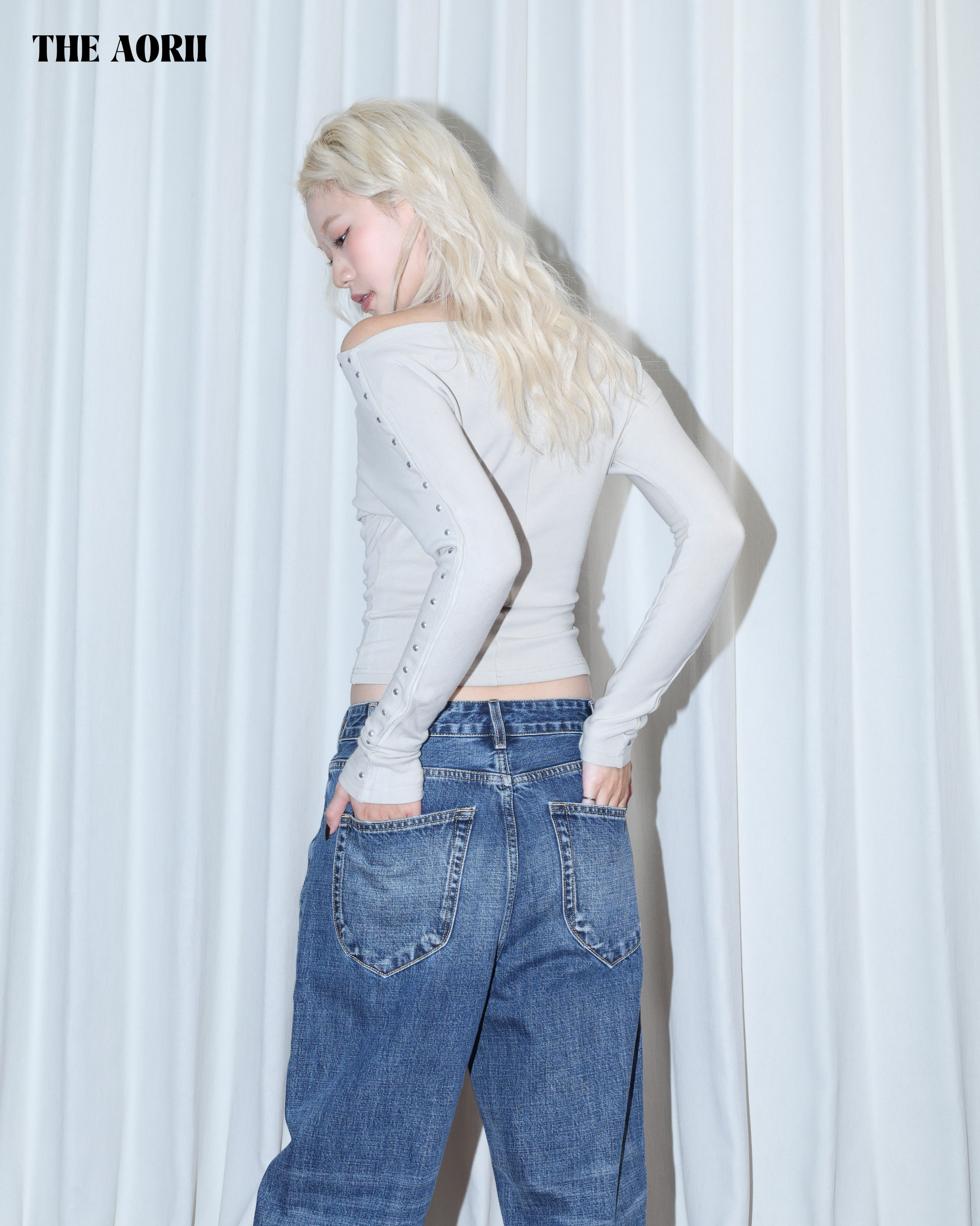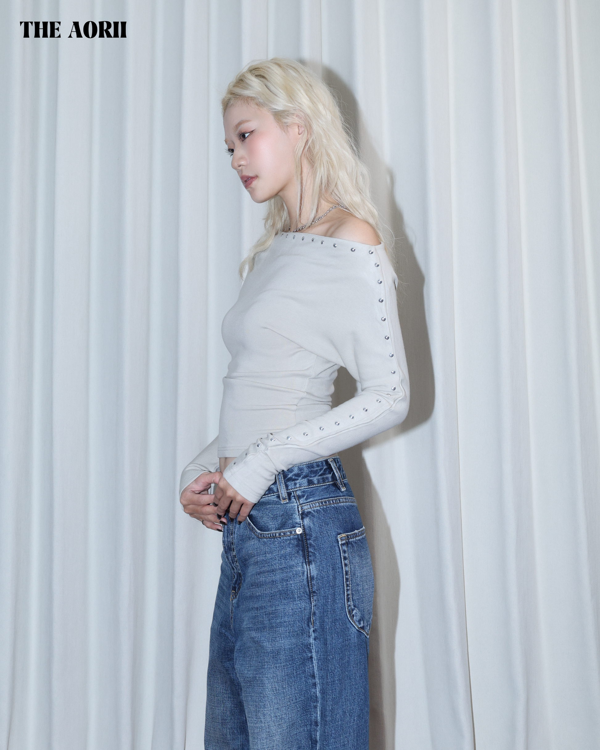 26025 (2color) - 杏 鉚釘一字領修身長袖上衣